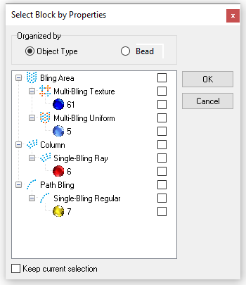 Otro nuevo modo de selección para objetos de bling, en base a sus propiedades: Por tipo de objeto, por tipo de llenado y por tipo de pieza.