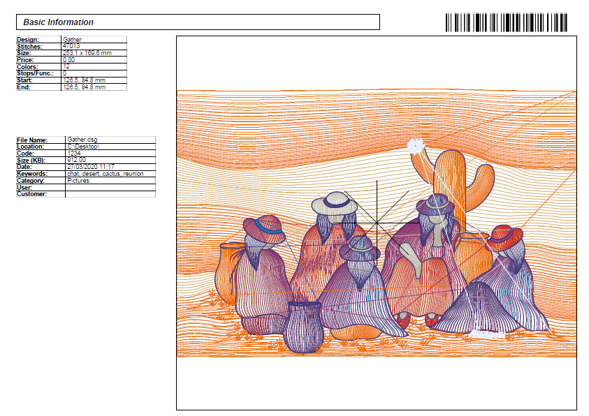 This template includes: •The drawing of the embroidery design. •General information of the design. •File information. •Thread information. •Sequence of commands. •Bar code. |