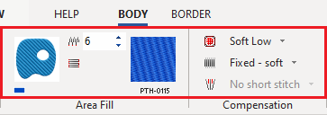 Define the object properties: ➢Click on the Edit Object function on the MAIN toolbar and select the object. ➢Set a stitch density value of 6 lines/mm. ➢Change the color of the section to blue. ➢Select the PTH-0115 pattern. ➢Set a "Fixed - Soft" Stitch Compensation. ➢Set a "Soft Low" Underlay. |