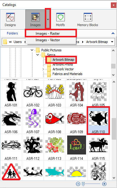 ➢As we need to import a raster image, select the media type Images-Raster on the Catalog tool. ➢Select the folder where the image is located. ➢The bottom panel of the Catalog displays the contents of the folder for the selected media type. ➢Selected the clown-hat 01 raster image from the Artwork Bitmap folder. ➢Drag the image into the workspace to load it. |