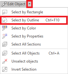 1.Click on the arrow next to the EDIT OBJECT function on the MAIN toolbar to activate the Object Editing mode and open a drop-down menu. 2.Click on "Select by Outline". 3.In the workspace, click on the mouse left button in any point of an imaginary irregular shape that encloses all the objects of the block. 4.Click on the mouse left button in all the consecutive points of the shape that encloses the objects. 5.Click on the "Enter" key to close the outline and define the block. You can also confirm the outline with the OK button on the context menu (mouse right click). |