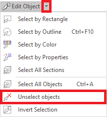 Use this tool to clear the current selection. It will not delete the objects, it'll just unselect them. 1.Click on the arrow next to the EDIT OBJECT function on the MAIN toolbar to activate the Object Editing mode and open a drop-down menu. 2.Click on "Unselect Objects". |