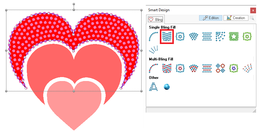 ➢Click on the object type and fill style you want for that object, on the Smart Design tool. In this case, use the Area + Uniform Bling Fill. |