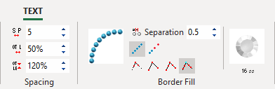 ➢Set a bling type by pressing on the bling type thumbnail on the tooltab. Use a Rhinestone Round 16ss - 3.8 mm Color Clear-Crystal stone. ➢Change the beads separation for both text objects to 0.5 mm. ➢For the "HOTFIX ERA" text object, set the letter spacing to 5.0 mm and word spacing to 40%. |