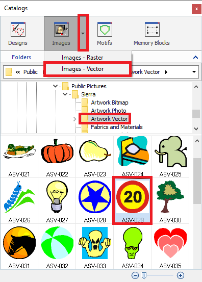 ➢Select the media type Images-Vector on the Catalog tool. ➢Select the folder where the image is located. ➢The bottom panel of the Catalog displays the contents of the folder for the selected media type. ➢Select the ASV-006 vector image from the Artwork Vector folder. ➢Drag the image into the workspace to load it. |