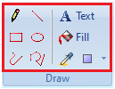 The Draw box offers different elements to draw on the working area: Lines, Rectangles, Curves, Polygons, Ellipses, etc. |