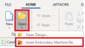 ➢Click on the tooltab Home ➢Click on the Open function (Open group) ➢Select the option "Insert Embroidery Machine File" |