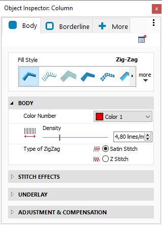 Compensate the lack and the heaps of stitches when the stitch direction of Zig-Zag stitches changes noticeably (sharp curves). The program creates intermediate stitches in curves or tight corners to avoid an unnecessary amount up of stitches (in the smaller edge) and spaces (in the larger edge). Intermediate stitches are only created if the object requires it (trigger at threshold).