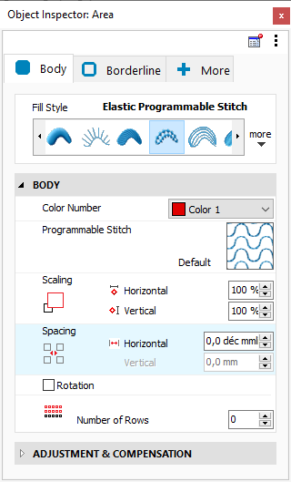This fill style places programmable stitches (small motifs) on a close area defined by a turning area object type. Programmable stitches are oriented according to the defined direction lines and transformed according to the area width.