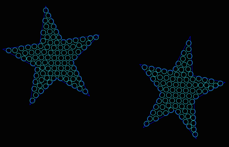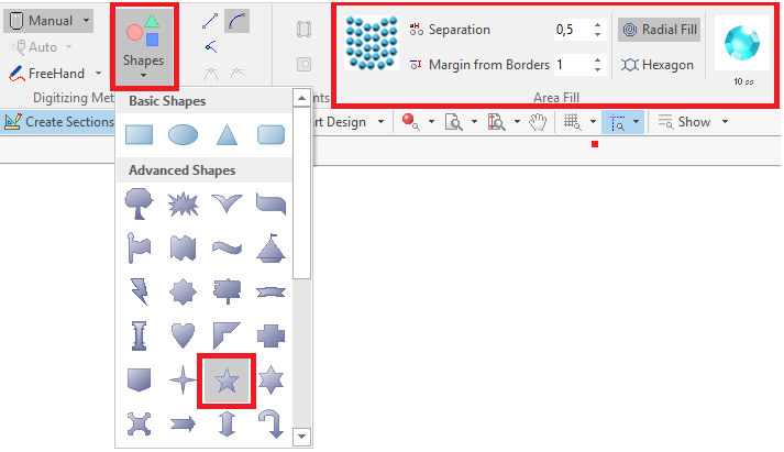 ➢Press on Shapes button, and select the star shape. ➢Set a 0.5 mm beads separation and select the Rhinestone Round 10ss - 2.8 mm Aquamarine Color stone. |