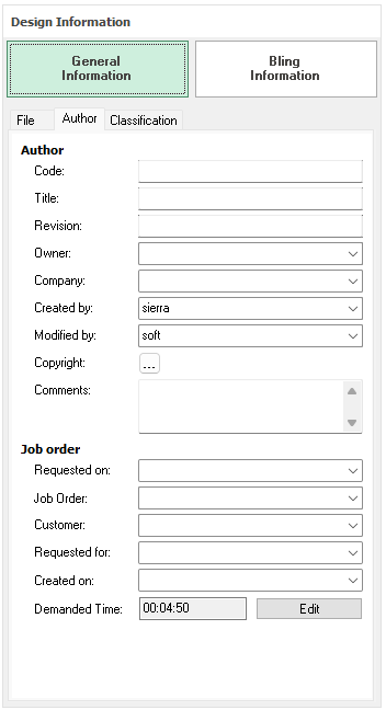 File It contains basic design file information such as design name, file name, storage path, file size, creation date, last edition date and file attributes. This is read only information. Author and Job Order It contains information about the design authorship and job order information. •Job Order: it includes date related with the job order number, requesting and creation dates, customer name and time used (computed automatically). •Author Information: it includes design codification, owner, author, demanded time, copyrights, etc. |