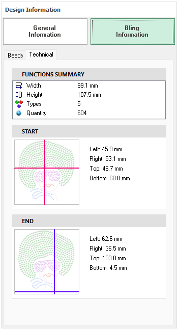 Beads Information about the bead types used in the design with thumbnails and bead count to easily identify them. Technical General technical information about the design, such as size, bead types and bead count. Also, geometric information about start and end points