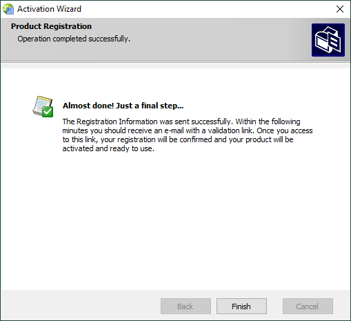 2.The wizard will connect to License Servers and send the registration information. A message with a validation link will be sent to the e-mail address you registered