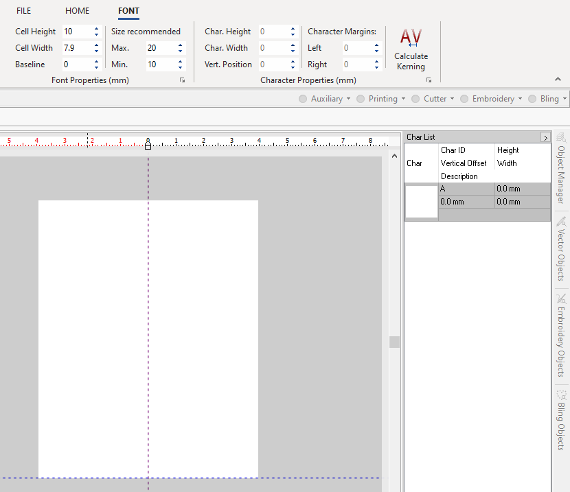 Using this tool to create a new embroidery pre-digitized font, you must create the font document and name it, digitize all the characters of that font with any digitizing method, and then save each digitized character on the font document.